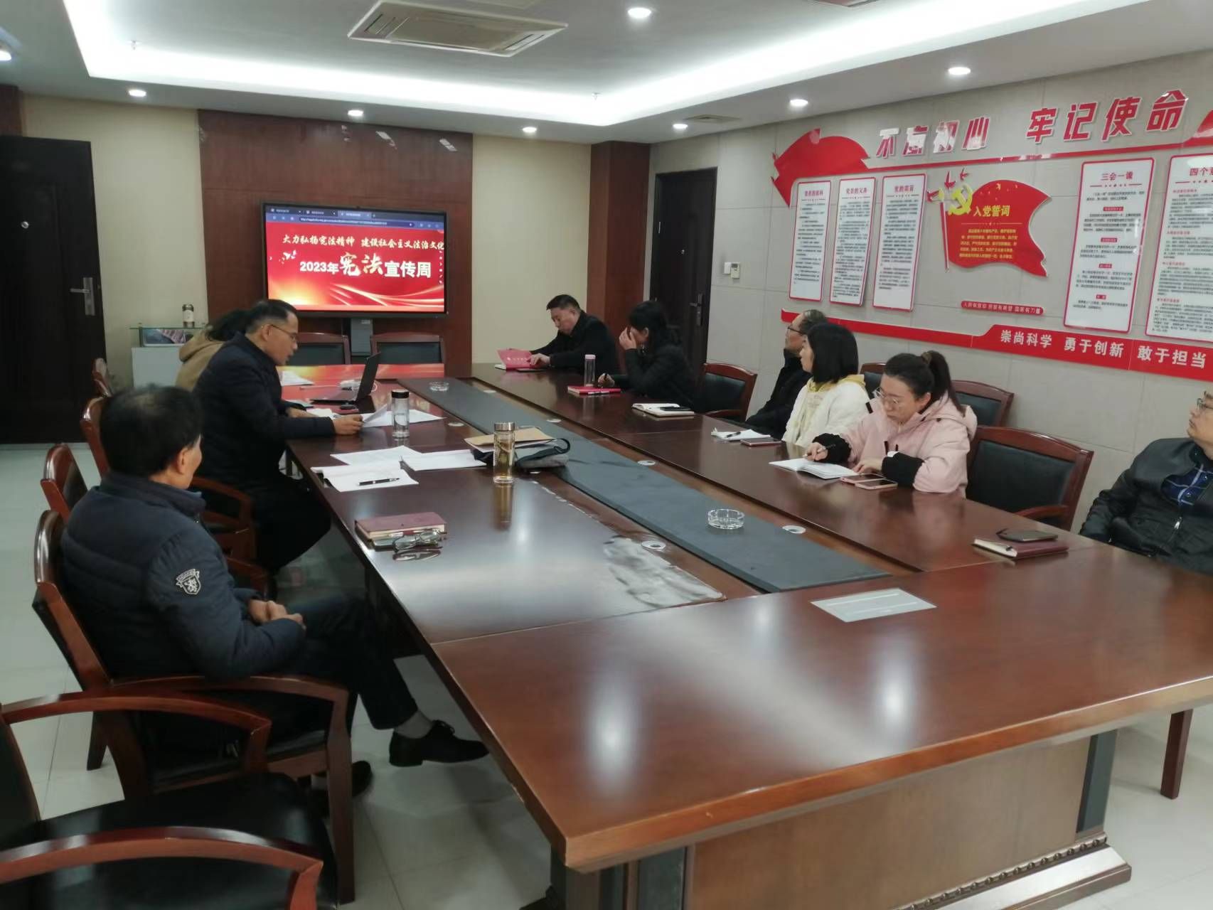12月4日上午,国资处在行政楼530召开会议。会议由支部书记黄海涛主持,全体职工参加。黄海涛传达了学校“关于开展2023年度‘宪法宣传周’活动的通知”文件,并带领大家学习习近平总书记关于宪法的重要论述。